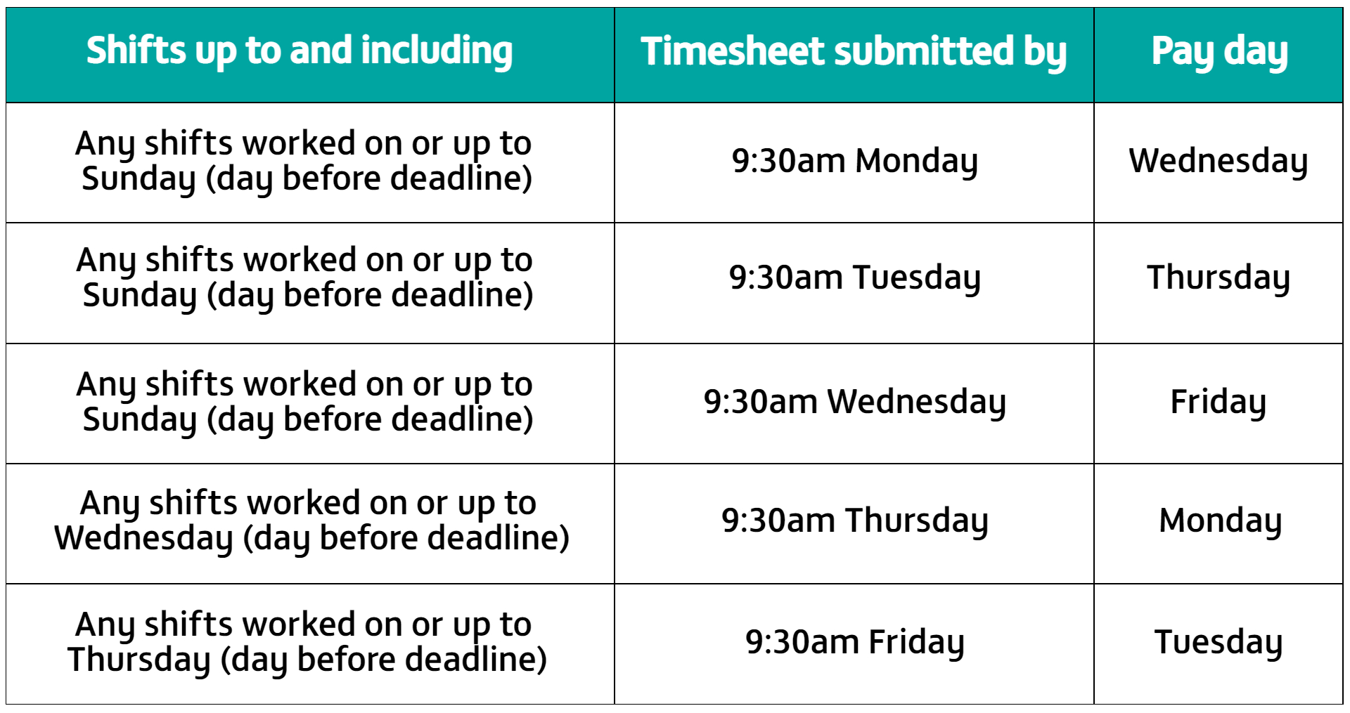 Timesheets received by 9.30am each day will be payrolled on that day providing they’re for shifts up to and including the previous Sunday and there are no queries on the timesheet.